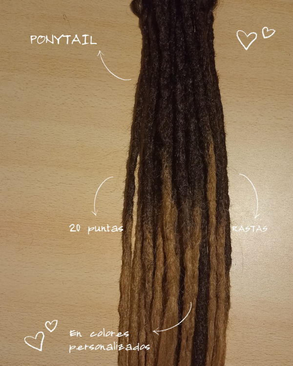 1 Ponytail DE VEINTE (20) DREADLOOCKS / RASTAS Con decoración incluida Personalizada, 4 hilos x 1 metro c/u y 6 cuff.